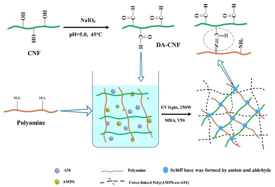 Figure 1 shows a schematic diagram for the preparation of the P(AM-co-AMPS)/PA/DA-CNF hydrogel. As shown, to construct the nanocomposite hydrogel system with the interaction with double networks, polyamine and DA-CNFs were used as interaction objects while AM and AMPS were applied to provide strength of the hydrogel. CNFs were firstly dialdehyded through sodium periodate oxidation by broke C2 and C3 groups on CNFs [21,22]. Then, AMPS, AM, DA-CNF, and polyamine were mixed and initiated with UV light to form nanocomposite hydrogel that contains double network through in situ polymerization. In this hydrogel, AM and AMPS were polymerized to form a network polymer, which was functionalized as the basic framework of the hydrogel. In addition, the aldehyde group of the DA-CNFs, reacted with the amino group in the polyamine chain, could further strengthen the network [23]. The double network in this semi-interpenetrating nanocomposite hydrogel system is expected to substantially improve the mechanical properties due to the synergistic effect between the two crosslinking methods. The hydrogels of P(AM-co-AMPS) without DA-CNFs and P(AM-co-AMPS)/PA/DA-CNF without double network crosslinking were also prepared and investigated as the control.
