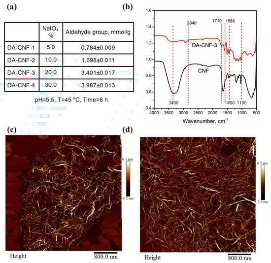 Characteristics of DA-CNF. (a) Oxidated CNF by sodium periodate. (b) FTIR spectra of CNF and DA-CNF. (c) AFM height images of CNF. (d) AFM height images of DA-CNF.