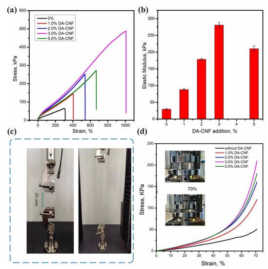 (a)Tensile curves of hydrogel with different DA-CNF content. (b) Elastic modulus and toughness calculated from the stress–strain curves. (c) Images of hydrogel showing excellent mechanical properties. (d) Compression properties of hydrogel.