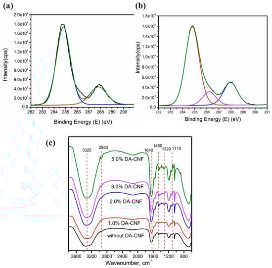 Characteristics of DA-CNF based hydrogel. (a) XPS of hydrogel without DA-CNF. (b) XPS of hydrogel with 3.0% DA-CNF. (c) FTIR spectra of hydrogel.