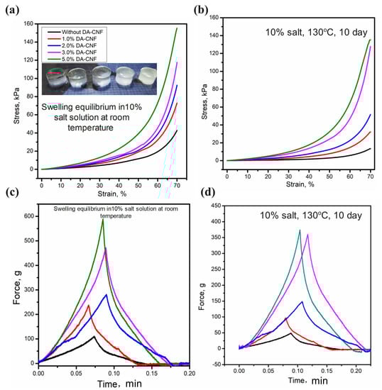 To further evaluate the effect of DA-CNFs on the hydrogel mechanical properties in swelling in salt solution, the compressive properties of swelling P(AM-co-AMPS)/PA/DA-CNF hydrogel before and after aging in 130 °C temperature and 10% salt solution were determined. As shown in Figure 5a the P(AM-co-AMPS)/PA/DA-CNF (0 to 5 wt%), after the expansion equilibrium, adding DA-CNF can significantly improve the compression properties of the gel, when the gel is aged for 10 days at 10% salt solution and 130 °C, the compressive strength of hydrogel with 5% and 3% DA-CNF can still be close to the pre-aging. For example, before high temperature aging, the compressive strength of hydrogel with 0% DA-CNF was 42 kPa, but when the expansion hydrogel was aging at 130 °C, 10% salt solution for 10 days, the compressive strength of hydrogel was decreased to 10.5 kPa; for the hydrogel with 5% DA-CNF addition, the compressive strength of hydrogel matained at 140 Kpa after aging at 130 °C, 10% salt solution for 10 days. Temperature and salt resistance results shows that the addition of DA-CNF can improve the stability of hydrogel at high temperature and salt solution, due to the DA-CNF addition: (1) played a fundamental role and as the “support” of the polymer network; (2) the double network crosslinking. The mechanical strength of hydrogels would be affected after swelling, thus the texture tests were performed when the swelling ratios of all hydrogels almost equaled (around 20) in salt solution. Force curves from texture tests of hydrogels are shown in Figure 5c,d. In this work, the texture intensity of the hydrogel is evaluated by measuring the hardness of the hydrogel, the hydrogel hardness is defined as the peak of the force curve when the probe is pressed to 70% of the thickness of the hydrogel. Incorporation of DA-CNF (1 wt% to 5 wt%) apparently reinforced the hardness of hydrogels. In addition, the texture intensity of the hydrogel with complete swelling equilibrium was tested (Figure 5c,d), P(AM-co-AMPS)/PA/DA-CNF (0 to 5 wt%) still showed the best texture intensity. In general, hydrogels cross-linked by double network suffer severe mechanical damage in salt solutions, and this phenomenon is evident in the nanocomposite hydrogel [28]. In conclusion, P(AM-co-AMPS)/PA/DA-CNF has better effect than P(AM-co-AMPS) in texture intensity after swelling is more outstanding than P(AM-co-AMPS).