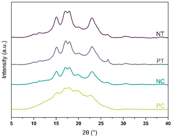 X-ray diffraction patterns of the four starches: NT, native tapioca; PT, pregelatinized tapioca; NC, native corn; PC, pregelatinized corn.