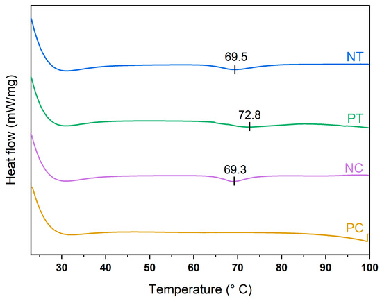 DSC graphs of the four starches: NT, native tapioca; PT, pregelatinized tapioca; NC, native corn; PC, pregelatinized corn.