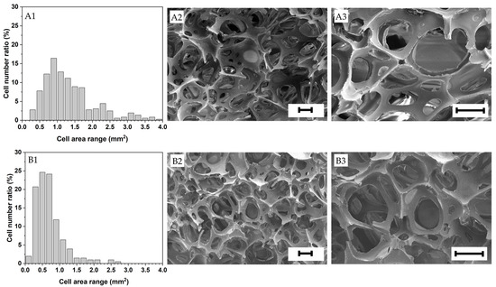 Cell area distribution and structure of the foams investigated (A1–A3) 20 wt.% gelatin, (B1–B3) 25 wt.% gelatin. Scale bar = 200 μm.