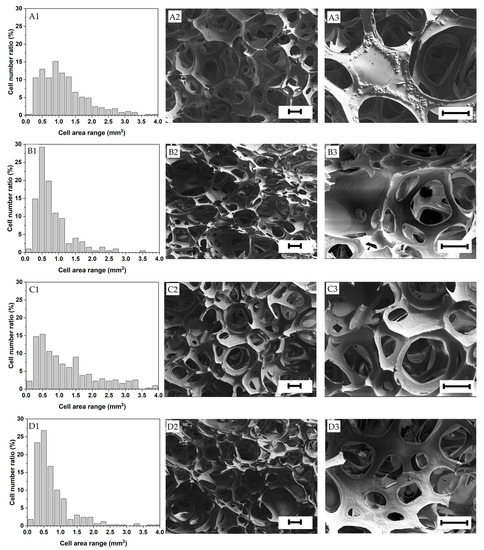 Cell area distribution and structure of the foams investigated (A1–A3) Native tapioca, (B1–B3) Pregelatinized tapioca, (C1–C3) Native corn, (D1–D3) Pregelatinized corn. Scale bar = 200 μm.