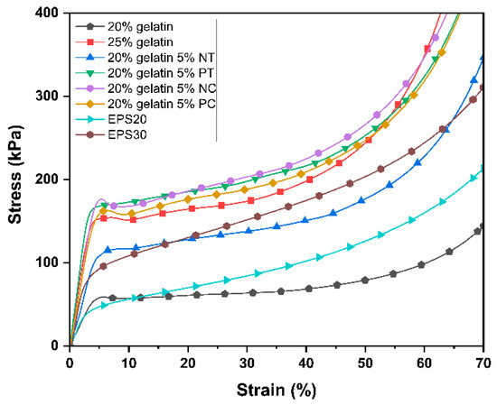 Comparison of typical compressive stress–strain curves (23 °C, 50% RH) for the gelatin and gelatin–starch foams produced by mechanical foaming.