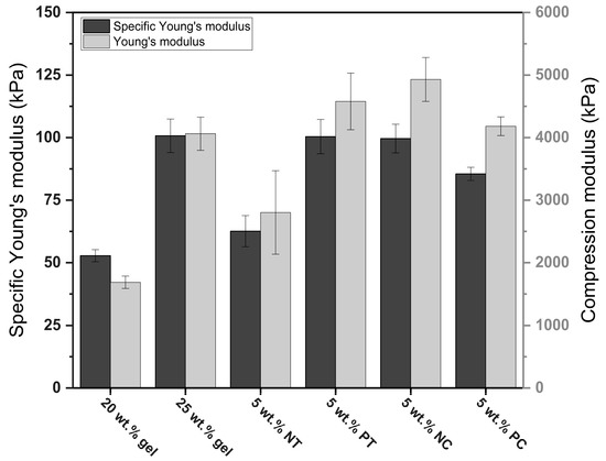Comparison of the specific modulus and compression modulus of the gelatin and gelatin–starch foams.