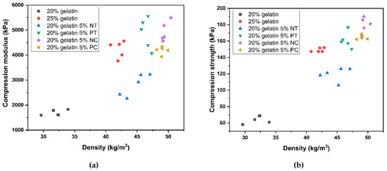 Figure 8a,b show the compressive modulus and strength as a function of density for the gelatin and gelatin–starch foams. A strong correlation between foam density and compressive strength and modulus, regardless of the formulation, has been reported in other works [45]. However, while Figure 8 shows higher density foams generally exhibited higher modulus and strength, there is not a strong relationship between the two variables, indicating an evident influence of the matrix composition on the compression properties.