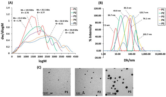 (A) Molecular weight distribution of HBPs derived from DMF GPC. (B) Particle size distribution of HBPs derived from DLS in water operated at 25 °C. (C) TEM images of HBPs stained by uranyl formate.