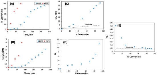 (A) Conversion vs. time plot. (B) Ln[M]0/[M] vs. time plot. (C) Dependence of Mn on conversion in comparison with theoretical standard RAFT: Mn,theo = [DMA]/[VBPC] × Mw of DMA × conversion + Mw of VBPC. (D) Dependence of Ð on DMA conversion. (E) DB vs. DMA conversion in comparison with theoretical values for RAFT copolymerization of DMA with VBPC at γ = 50 and 50 wt%.
