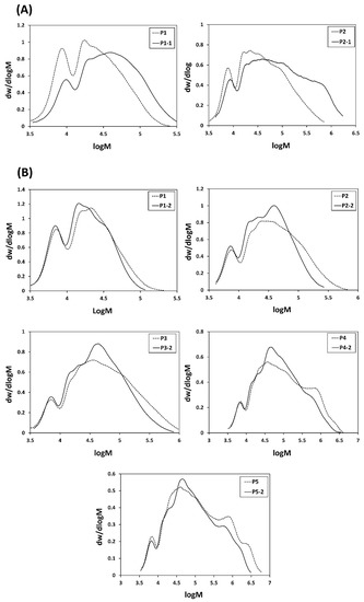 DMF GPC molecular weight distributions of HBPs before (dotted lines) and after aminolysis/HEA conjugation (plain lines) (A) in the absence Me2PPh, and (B) in the presence of Me2 PPh.