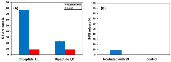Since the enzyme is stereoselective, only the polymer conjugate with the L,L configuration was made and examined. The incubation of the polymer conjugate with the S9 fraction resulted in a very low (9%) cleavage of 5-FU (Figure 4B) in comparison with the quantitative cleavage reported by rat liver tritosomes at pH 5.5 of 5-FU and 5-FU derivatives [41,58]. The low percent release can be due to the limited accessibility of the S9 fraction to the oligo-peptide spacer due to the relatively compact structure within the polymer conjugate.