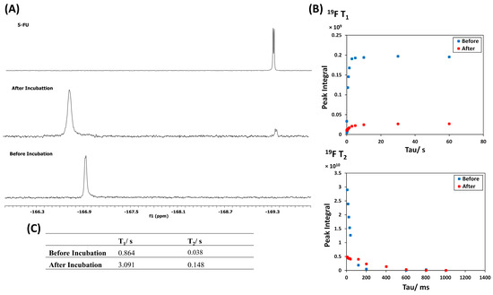 The ability to monitor 5-FU release using 19F NMR for MRI applications was then examined. The degradation mechanism of 5-FU polymer conjugate in the presence of tritosomes (mixture of lysosomal enzymes well known to be highly expressed in cancer cells) involves the release of a dipeptide derivative of 5-FU, which further degrades into free 5-FU [41,58]. However, the degradation mechanism might vary depending on the enzymes used [59]. To avoid handling animals, the release of 5-FU was studied using commercial S9 fraction from rat liver instead. The S9 fraction is a mixture of microsomes and cytosol and contains a wide range of metabolizing enzymes [60].