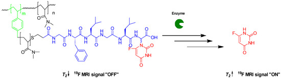 More recently, significant efforts have focused on the development of stimuli-responsive 19F MRI contrast agents. These contrast agents remain invisible until encountering a certain stimulus such as pH [20,30,31], redox [31,32], or enzyme [33,34,35,36,37]. In particular, a number of interesting strategies have been proposed to obtain an enzyme-responsive 19F MRI switch. The mechanism of activation is mainly based on either a chemical shift change [38,39] or a signal intensity switch induced by paramagnetic relaxation enhancement (PRE) upon enzymatic cleavage [33,34,35,36,37]. Despite the success in the use of the chemical shift approach to detect enzyme activity [38,39,40], the approach is dependent on the magnitude of the chemical shift change being sufficiently large, which is often a limiting factor. In contrast, a later technique based on the PRE effect seems very promising. For example, Mizukami et al. [36] reported a switchable contrast agent, where a Gd-based chelate was linked to a trifluoromethoxy benzyl group via a degradable peptide. Initially, the Gd(III) ion conveys an intramolecular PRE effect upon the fluorine nuclei, which leads to the T2 relaxation time shortening to the point of being undetectable. Upon cleavage of the peptide, the intramolecular PRE on the 19F nuclei is effectively negated, resulting in T2 lengthening and, therefore, significant enhancement of the signal.
