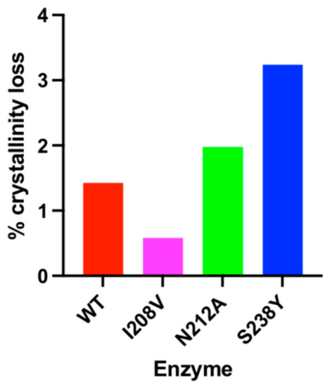 In order to further characterize the PET-degrading activity of the mutant variants, changes on the structure of the polymer were analysed using DSC. Similar to that reported previously [18], IsPETase induced a reduction in the crystallinity of PET. All three mutant variants performed differently than the WT enzyme under this observation, with the S238Y and the N212A mutants showing 3.3- and 1.4-fold increased activity, respectively. In contrast, the I208V mutant barely altered the crystalline structure of PET (Figure 5).