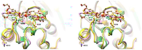Stereoview of the superposition of IsPETase WT (tan) and the mutant variants, I208V (magenta), N212A (green), and S238Y (yellow) with PET bound. PET is represented as balls and sticks, while the mutated residues are depicted as sticks models. The catalytic residue S160 is also shown.