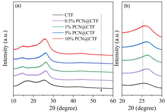 Morphological and structural aspects of the samples were probed by TEM analysis. As illustrated in Figure 1, TEM images of both pristine CTF and 1%PCN@CTF showed an analogous typical nanosheet structure []. As shown in Figure 2a, the pure CTF sample displayed two XRD peaks at 15.9° and 25.7°, attributable to the (002) plane resulting from interlayer stacking of the π-conjugated rings and the (002) facet representing the (100) facet corresponding to the in-plane long-range molecular order of the polymer network, respectively [,]. The similar diffraction patterns of the x%PCN@CTF samples suggested that the appending of the pyridine rings had little effect on the crystalline structure of CTF. Enlarged XRD patterns of the x%PCN@CTF samples (Figure 2b) showed that the appending of PCN lowered the interlayer stacking distance, which caused the (002) diffraction peaks to shift to higher angles in comparison to the pristine CTF [].