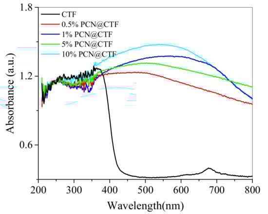 The ability of the photocatalysts to absorb light was confirmed by the UV/Vis diffuse-reflectance spectra presented in Figure 4. The x%PCN@CTF samples displayed improved absorption in the 400–550 nm range, whereas no discernible absorption was observed for pristine CTF. The appending of PCN on CTF gave rise to an absorption shoulder, indicating enhanced photon absorption. Notably, x%PCN@CTF exhibited significantly higher absorbance intensity across the visible-light spectrum compared to pure CTF, which could only be attributed to the protective PCN layer on the CTF surface.