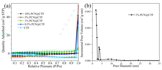The precise surface areas and porosities of the prepared samples were determined by the N2 adsorption-desorption technique, as shown in Figure 5. The as-obtained samples displayed typical type IV isotherms and discrete hysteresis loops (H3-type) in a high relative pressure range (p/p0, 0.61–1.0), showing the presence of slit-like mesopores and capillary condensation []. The surface areas of pure CTF, 0.5%PCN@CTF, 1%PCN@CTF, 5%PCN@CTF, and 10%PCN@CTF were 0.10, 0.31, 3.26, 2.33, and 1.19 m2 g−1, respectively. Thus, compared with pristine CTF, the x%PCN@CTF samples attained increased BET surface areas, confirming that PCN had been successfully appended on the CTF and modified its porous structure and surface area. The 1%PCN@CTF sample displayed a relatively larger major pore (Figure 5b). With a sizeable amount of PCN adsorbed on the substrate, the hierarchical structure with a larger surface area apparently provided more catalytically active sites [].