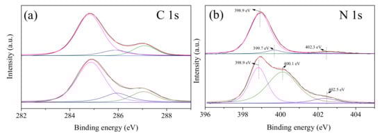 Deconvolution of the C 1s peaks (Figure 6a) of CTF and 1%PCN@CTF revealed three primary peaks at 287.1, 285.9, and 284.6 eV. These peaks could be attributed to the presence of C=O, C=N, and π–π* bonds, respectively, as reported in previous studies [,]. The N 1s pattern of CTF (Figure 6b) showed three peaks centered at 398.9, 399.7, and 402.3 eV, attributable to sp2-hybridized nitrogen (N-C=N/C-N=C), tertiary nitrogen (N-C3), and terminal amino groups (C-NH2), respectively, in accordance with reported studies []. Remarkably, the peaks assigned to N-C3 and C-NH2 in the 1%PCN@CTF sample shifted to higher binding energies, indicating a reduction in the electron density around the nitrogen atoms due to the appending of electron-withdrawing pyridine rings on the CTF framework. Additionally, compared with CTF, the increased carbon content in 1%PCN@CTF samples suggested the significant changes in carbon structure induced by PCN.
