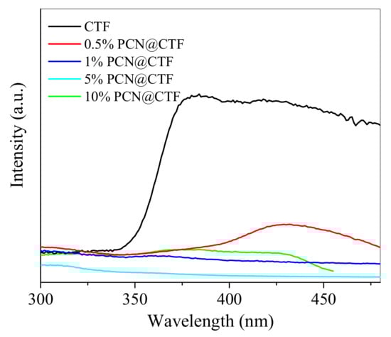Figure 7 displays the fluorescence spectra of pure CTF and the x%PCN@CTF photocatalysts, each acquired at an excitation wavelength of 325 nm. Notably, the 5%PCN@CTF sample showed the lowest PL signal peak intensity among all of the samples, indicating maximum efficiency in separating photoinduced electron–hole pairs []. The 1% PCN@CTF sample also showed a weak PL signal. Appropriate preparation of the photocatalytic system enabled the successful promotion of photogenerated charge carrier separation, which effectively increased the photocatalytic activity. It is noteworthy that, compared to pure CTF, the x%PCN@CTF catalysts produced fluorescence peaks with substantially lower intensity.