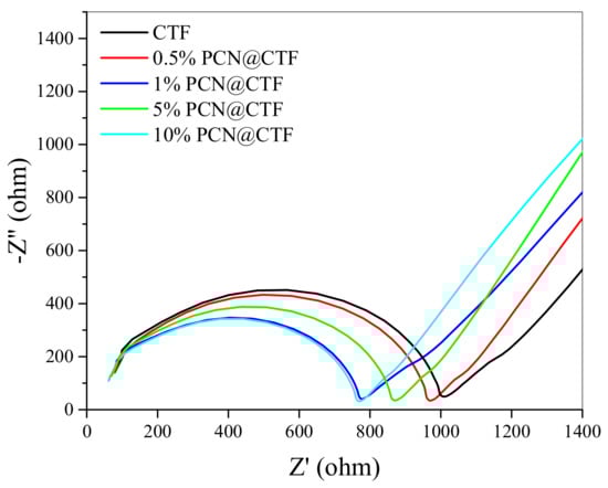 Additionally, electrochemical impedance spectroscopy (EIS) was conducted in order to elucidate interfacial electron mobility []. As demonstrated in Figure 9, the EIS Nyquist plot featured a smaller semi-circle for the 1%PCN@CTF electrode, indicating a lower electrical resistance and a faster interfacial charge-transfer capability than those of the primary CTF electrode. Thus, the charge-transfer resistance on the 1%PCN@CTF surface was decreased, resulting in the effective separation of e−–h+ pairs, consistent with the findings from i-t analysis. During the photocatalytic reaction procedure, the 1%PCN@CTF photocatalyst showed the highest separation and migration efficiency, as demonstrated by the abovementioned data, far exceeding that of the pristine CTF.