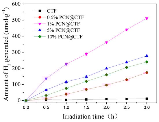 Decorating semiconductor photocatalysts with carbonitrides, especially pyridine-type carbonitrides (PCN), has recently been proven to be an effective strategy for promoting photocatalytic hydrogen evolution activity [,]. For example, PCN/CTiO2@TiO2−x and PCN-based donor-π-acceptor (D-π-A) networks have been shown to offer excellent hydrogen production performance [,]. Therefore, modification of CTFs with PCN appears to be an effective strategy for achieving satisfactory photocatalytic hydrogen production activity. Furthermore, to the best of our knowledge, research on such modification of CTFs has not been reported previously.