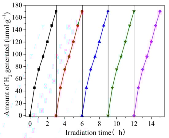 The photocatalytic stability of a catalyst is clearly essential for its long-term utility. The 1%PCN@CTF sample was thus subjected to recycling procedures. The test was run cumulatively under visible-light irradiation for 15 h, with evacuations after every 3 h. It was not necessary to replenish the initial amount of methanol because it was sufficient for the duration of the entire activity test. The average linear H2 evolution rate measured over 1%PCN@CTF for 15 h was 168.9 ± 2.1 μmol h−1 g−1, with a standard deviation of 3.3%, as shown in Figure 12. Thus, the 1%PCN@CTF photocatalyst demonstrated continuous and sustained H2 evolution without any loss of photocatalytic activity.