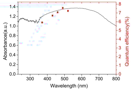 To understand the relationship between photoactivity and light absorption of 1%PCN@CTF, we examined the quantum efficiency (QE) for the evolution of H2 from water as a function of the wavelength of the incident light. The calculated QE values were (5.91 ± 0.10)%, (6.90 ± 0.15)%, (6.70 ± 0.12)%, (7.08 ± 0.13)%, (7.57 ± 0.10)%, and (7.23 ± 0.12)% at wavelengths of 370, 400, 430, 460, 490, and 520 nm, respectively. Figure 11 illustrates the correlation between QE and the UV/Vis absorption spectrum of 1%PCN@CTF. The wavelength dependence of QE was consistent with photo-absorption by the catalyst initiating the reaction.