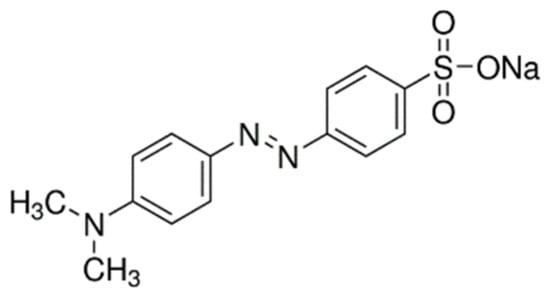 The MO dye, a pH-sensitive dye, sodium 4-{[4-(dimethylamino)phenyl]diazinyl}benzenesulfonate with a molecular weight of 327.33 g/mol (Acros Organics, Geel, Belgium) and electrolyte NaCl (Sigma-Aldrich, Oakville, Canada) were used to dye cotton fabric. The structural formula of MO is shown in Figure 1.