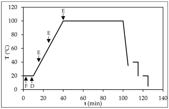 Prior to dyeing, preliminary experiments were conducted to determine appropriate LR and the concentration of the electrolyte (NaCl), while the concentration of the MO dye was taken from literature in which the dyeing of cotton fabrics was carried out using the MO dye [8]. Thus, exhaust dyeing was carried out at LR of 1:20 and 1:40 at five different NaCl concentrations, namely 3, 10, 20, 30 and 40% o.m.f. The preliminary tests showed that the highest adsorption of the dye was obtained at lower LR and higher NaCl concentration. Therefore, the research was continued with LR of 1:20, a NaCl concentration of 30% o.m.f., and a MO concentration of 0.3% o.m.f. Dyeing of the 10 g cotton fabric was carried out in the Starlet 2 laboratory dyeing machine (Daelim, Seoul, Republic of Korea) according to the diagram shown in Figure 2. Dyeing lasted 60 min at optimum dyeing temperature (100 °C). After dyeing, two rinses were performed, the first at 40 °C and the second at room temperature with deionised water. The dyed fabric was dried in the air at room temperature (23 °C).