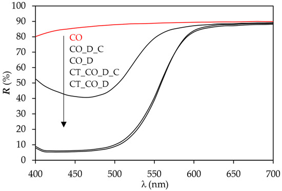 Reflection curves of samples CO, CO_D, CO_D_C, CT_CO_D and CT_CO_D_C.