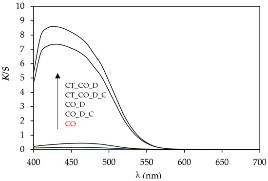 The reflectance curves in Figure 4 shows that the sample CO_D reached the lowest reflectance at 460 nm and thus the highest K/S value (Figure 5), while the sample CT_CO_D reached the lowest reflectance at 430 nm and thus the highest K/S value. The latter indicated that the cationisation causes a shift of the dye adsorption to lower wavelengths, i.e., a hypsochromic shift. The sample CT_CO_D reached the highest colour depth, which is in good agreement with the percentage of dye exhaustion. After the cationic after-treatment of the samples, the R values at 430 nm or 460 nm increased, and consequently, the values of K/S decreased, which can be seen in Figure 4 and Figure 5, due to the desorption of the dye MO.