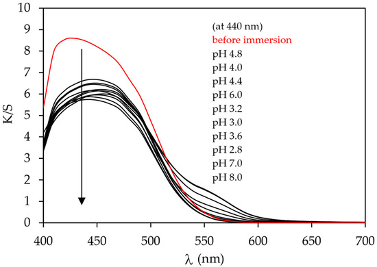 The K/S values of samples immersed in buffer solutions decreased compared to the unsubmerged sample, which was attributed to the dye desorption from the dyed fabric. In Figure 6, the shift of curves K/S vs. λ was noticed to longer wavelengths or so-called bathochromic shift in buffer solutions of pH values 2.8, 3.0, 3.2, 3.6, and 4.0. The latter was ascribed to the colour change of the samples. In acidic pH, the colour of methyl orange changes from orange (A) to red (B) due to dye protonation, which is presented in Figure 8.