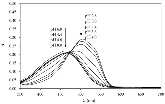 The CIELAB values of sample CT_CO_D, collected in Table 4, show that the lightness (CIE L*) increased with the increase of the pH value from pH 2.8 to 8.0. Values of CIE a* stay positive and almost unchanged from pH 2.8 to 3.2 but then slightly decrease in pH range from 3.6 to 8.0, whilst the values of CIE b* increase and stay positive when pH values increase from 2.8 to 8.0. This means the tested samples CT_CO_D become lighter, slightly less red and yellower by increasing pH values from 2.8 to 8.0. The same trend was noticed for sample CT_CO_D_C (Table 4). The colour change of dyed samples was detected at pH 4.0, the same pH at which the dye MO is responsive in buffer solution (Figure 9). In the solution, the shift of colour was noticed from 465 nm at pH 4.4–8.0 to 473 nm at pH 4.0 and 505 nm at pH 2.8. This means that the colour of the dye changes from orange to red at lower pH values. The bathochromic shift is clearly seen in Figure 9. Comparing the absorption spectrum of MO dye in buffer solution with curves of K/S vs. λ shows that the MO dye responses to pH values differ when dissolved in buffer solution than when bonded to cotton fabric. The same behaviour of dye was noticed by researcher Lien Van der Schueren et al. [5,9]. It was assumed that the cause for this phenomenon is due to dye–fibre interactions that hinder the dye from reacting faster with H+ ions in acidic buffers, as in the case of buffer solutions where the dye is in free form.
