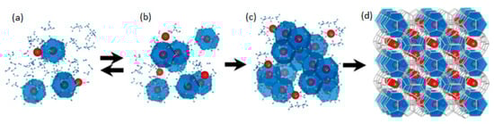 Labile cluster model of hydrate nucleation: (a) labile clusters, (b) agglomeration of clusters, (c) primary nucleolus, and (d) hydrate crystal. Reprinted from Ref. [32].