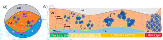 The formation of technogenic gas hydrate deposits in a water–oil–gas dispersed medium is mainly a three-stage process: (i) hydrate nucleation; (ii) hydrate crystal growth and agglomeration; (iii) formation of a hydrate plug and blocking of the flow line, which can lead to a complete blockage of the processing pipeline (Figure 3).
