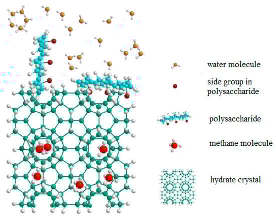 The properties of these polysaccharides can be explained by the binding of the anhydroglucose unit of polysaccharides to the open cavities of the hydrate structure. Hydroxyl groups in the anhydroglucose link contribute to a strong interaction between the polymer and water molecules, thereby preventing gas molecules from entering the hydrate structure, which leads to further inhibition of hydrate crystal growth, and a decrease in the gas content and its absorption. The difference in the effectiveness of polysaccharide inhibition is most likely due to their different side chains. The anhydroglucose group in the guar gum skeleton structure can increase its adsorption on the hydrate surface, thereby leading to the lowest IL/IS ratio compared to other polysaccharides. The multi-branched complex molecular structure of gum arabic may be the reason for it having the worst inhibition rates among the polymers tested. A possible mechanism of hydration inhibition by polysaccharides has been suggested (Figure 8) [79].