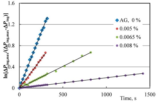 The second criterion allowed for estimating the change in the rate of gas hydrate formation in the presence of a polysaccharide. It was assumed that the change in pressure in the cell from time ΔPing = P0,ing − Ping is proportional to the amount of hydrate formed Ni, the maximum pressure change ΔPing,max = P0,ing − Ping,min). The formal kinetic equation in this case can be represented as an equation for a first-order reaction: