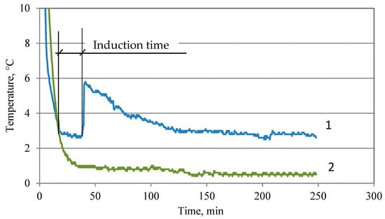 Effect of monoethanolammonium salt of carboxymethylcellulose on hydrate formation in THF-H2O. 1—temperature change in the absence of polysaccharides; 2—temperature change in the presence of 0.1% polysaccharides.