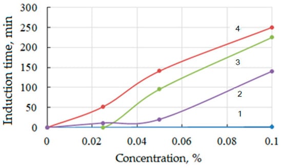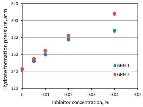 Kinetic inhibitors reduce the rates of nucleation and crystal growth of gas hydrates, allowing the multiphase flow to pass through a section of the pipeline that is dangerous for gas hydrate formation. The effectiveness of their use is evaluated by the degree of subcooling and the time of induction [72]. Known KHIs have the ability to prevent hydrate formation at temperatures around 12–15 °C, and the best inhibitor to date has inhibited hydrate formation under 24.1 °C hypothermia conditions [73]. However, the use of kinetic inhibitors of hydrate formation is limited by the low subcooling temperature and water content (40–60%) of the water–oil fluid, since the hydrate suspension under these conditions becomes too viscous and the inhibitor efficiency is low [70].