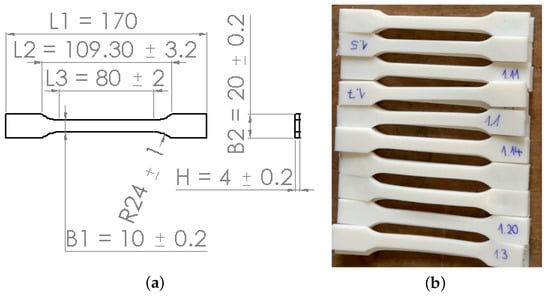Geometry of the dog-bone-shaped tensile specimen according to DIN EN ISO 527-1 (unit: mm): (a) a sketch; (b) some printed specimens using injection molding method.