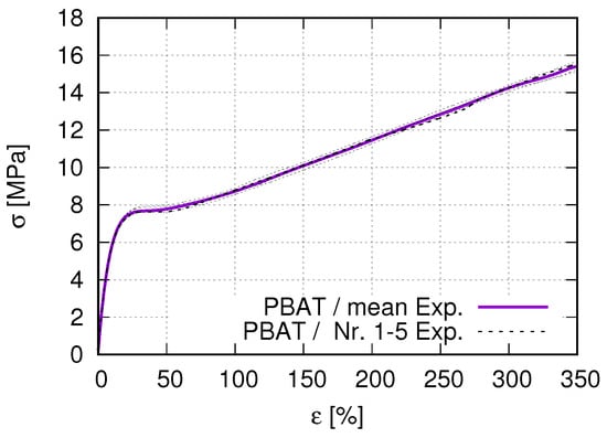 To determine the mechanical properties, tensile tests were carried out on a universal testing machine 1455 (ZwickRoell, Ulm, Germany). The test speed was set to 5 mm/min. for all tested specimens with a clamping length of 115 mm. For this purpose, tensile test specimens were produced using injection molding and 3D-printing methods, resulting in very similar material properties, such as the stress–strain behavior and Young’s modulus. Since the FE simulation uses the data from the former one, this work will show used technical parameters and measured results from the injection molding method. Table 1 lists the parameters used in the injection molding process. The tensile behavior of neat PLA and PBAT can serve as the comparative basis for their blends’ behavior. This study uses the tensile flow behavior to calibrate a suitable material model (theory) for successfully simulating the auxetic behavior. The geometry of the tensile test specimen is printed according to DIN EN ISO 527-1 standard. Figure 1a,b illustrates the geometry of the used dog-bone-shaped tensile flat specimen and some specimens produced by the injection molding process, respectively. All the performed tensile tests are strain-controlled in the current work. Figure 2 denotes the measured true stress–strain curve of the PBAT specimen shown in Figure 1. The test is performed five times. The purple solid line in Figure 2b is the mean value from all five stress–strain curves. The measured Young’s modulus is about 38.13 MPa and the corresponding yield stress = 7.76 MPa. Practically, the material yields before the 7.76 MPa stress is reached (Figure 2). After the yielding, a stress plateau zone appears for a strain range of approximately 25%, namely at about 25–50% loading strain. Beginning at about 50% strain, the stress increases again nearly linearly. There is no break at 350% strain, the maximum strain shown in Figure 2. The PBAT specimen shows no failure, even at 500% strain, the maximum load of the testing device. According to Ferreira et al. [42], PBAT with a Young’s modulus of 20–35 MPa and a tensile strength of 32–36 MPa possesses an elongation at the break of about 700% strain, which is higher than most other biodegradable polymers. Jiang et al. [43] reported a strain of 710% at failure for PBAT.