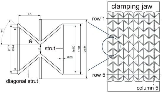 Schematic representation of a single honeycomb and its dimensions in [mm] in an auxetic structure with 5 × 5 cells. Figure reprinted from Ref. [40].