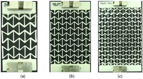 Printed auxetic structures made of PBAT mounted in the tensile loading facility: (a–c) with 3 × 3, 5 × 5, and 7 × 7 cells in a scaled view at slightly loaded status (loading strain ≤ 3%), respectively.