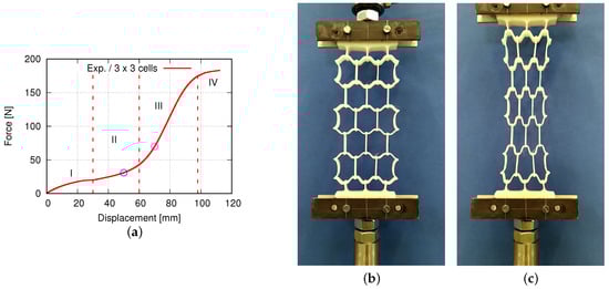 Figure 3 displays the dimensions of the unit cell and a sketch of an auxetic structure with 5 × 5 cells used in this study. Such a specimen is called 2D, since the third dimension in Z direction is extruded with the 2D geometry in the X-Y plane. The strain-controlled tensile tests performed on auxetic structures are executed on specimens with different total numbers of cells, namely 1 × 1, 3 × 3, 5 × 5, and 7 × 7, and no less than five times for each case. Figure 4 demonstrates three printed auxetic structures with 3 × 3, 5 × 5, and 7 × 7 cells, which are mounted in the tensile loading machine at slightly loaded status (loading strain ≤3%). Figure 5a denotes the force–displacement curve for a structure with 3 × 3 cells. The curve evolution presents four regions, I–IV, as marked with red dashed lines (Figure 5a). The first region I covers about the loading region of 0 mm to 30 mm, where the force increases corresponding to the loading increment, and the curve is convex. The second region II is from 30 mm to 60 mm. As in region I, the force increases at a moderate rate in region II, but the force–displacement curve is concave. In regions I and II, it also shows a plateau from about 25 mm to 35 mm. These two regions could be auxetic deformation related. Compared to region I and II, region III illustrates a rapid force increment. The increment is about 42 N by 60 mm loading for the former, while 132 N by further 38 mm loading for the latter. After this rapid force increment in region III, the curve illustrates another plateau, a slow force-increasing rate. The specimen is not broken at the given max loading in Figure 5a. Figure 5b,c present the deformed status of the specimen at 50 mm and 70 mm loading, which correspond to the blue and magenta circles in Figure 5a. The structural status in Figure 5b nearly reaches the auxetic deformation limit, i.e., the Poisson’s ratio of the structure is still negative. Figure 5c is not auxetic behavior relevant anymore, but proves the extraordinary ductility of PBAT.