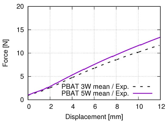 In order to obtain the optimized total cell number in an auxetic structure, 3 × 3, 5 × 5, and 7 × 7 cells are selected. Figure 12 presents their structural Poisson’s ratios for acrylonitrile butadiene styrene (ABS) [53,54]. It is pointed out that results shown in Figure 12 are from an early work, where the J theory was applied. It implies that the result shown in Figure 12 is material independent. This FE simulation (Figure 12) considered the residual stress, due to cooling down, which was predicted by the software Digimat-AM [55]. It is assumed that the Poisson’s ratio near −1 corresponds to the optimal structure in the sense of the lateral deformation. Even though the auxetic structure with 7 × 7 cells shows slightly better structural deformation behavior (Poisson’s ratio nearer to −1) than with 5 × 5 cells, the latter (5 × 5 cells) is taken as the better one. The reason is that the former (7 × 7 cells) needs a nearly double amount of materials and, thus, more costs. Based on further study results, other material models (than J theory) are applied to simulate the deformation behavior of PLA and PBAT polymers. As mentioned, the force–displacement curve is preferred to present the macro tensile deformation behavior of auxetic structures. Figure 13 illustrates the comparison of the force–displacement curves between the test and the simulation, where the FE-predicted forces needs a factor of two to be comparable with the experimental data. The measured curves from the experiment show a negligible small difference. Hence, the mean value of all the testing data are taken here. Figure 14 displays the experimentally measured and numerically predicted Poisson’s ratio evolution of the auxetic structure (Figure 3), according to the loading strain. The curve obtained from the average of five rows shows that the two rows as neighbors of the clamping jaw should be excluded in calculating the structural Poisson’s ratio, since the BCs influence their deformation too much. This effect of BCs leads to unusual auxetic behavior apparently. In Figure 14, only the numerical curve calculated from three rows is comparable to the experimental one.