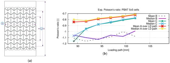 One of the essential characteristics of the auxetic structural deformation behavior is the Poisson’s ratio. To the authors’ knowledge, no international standard method is available for calculating the Poisson’s ratio of the auxetic structure. In this work, three different approaches are used. Figure 7a shows the necessary lengths used for the calculation, and Figure 7b plots the results. A, B, C, and D in Figure 7a present the width of the whole structure, the length of the middle three rows, the specific length of five rows, and the total specimen length. For lengths indicated by A to D, the alteration would be firstly calculated for each concerned row from which the engineering (nominal) strains are calculated. The Poisson’s ratio is obtained by applying Equation (1). In this case, “A” is used in calculating and B to D . All the calculated evolutions of the Poisson’s ratio illustrate an increasing tendency according to the loading. In Figure 7b, “mean” presents that the plotting value is taken from the mean value among all the measured data, while “median” presents the median value of the measured minimum and maximum values. The two curves in Figure 7b, marked with “Mean B” and “Median B”, behave zig-zag-like. Still, the calculated Poisson’s ratios are mostly smaller than −1, which implies that the lateral deformation (strain) is more significant than the one in the loading direction. The curves marked with “Mean C” and “Median C” show Poisson’s ratio with values mostly greater than −1. The last two curves present few differences, and the one with mean value is preferred to present the Poisson’s ratios of the auxetic structure, where the “LD path” presents the loaded displacement of the whole specimen. Observed from both tests and simulations, the deformation of the two rows, as neighbors of clamping jaws, is influenced by the BCs too much. It causes a large deformation discrepancy, compared to the inside rows, which is also a reason why rows 1 and 5 (Figure 3) are excluded in Poisson’s ratio calculation for the auxetic behavior.