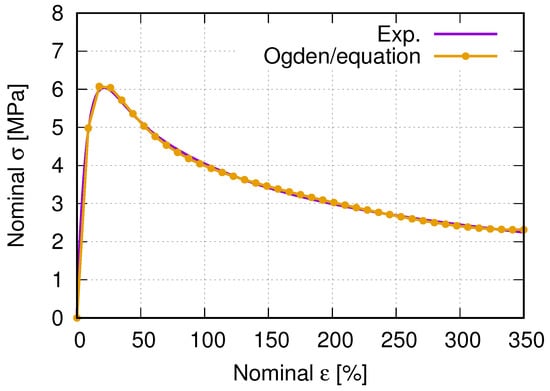 The above-mentioned Ogden model is a particular form of the strain energy potential for the hyperelastic material model. In addition to Ogden, polynomial, Arruda-Boyce, and Van der Waals forms are available in ABAQUS as the incompressible or almost incompressible models. The current case belongs to the latter. The hyperelastic material behavior describes the deformation behavior of polymers and other rubber-like materials in ABAQUS. For such hyperelastic materials, the constitutive behavior is defined as total stress–total strain relationship different from that of the rate formulation in the context of history-dependent materials. In the current case, the total volume change of a given point J is defined as the determinant of the deformation gradient , where J and lead to as the deformation gradient with the volume change eliminated. Furthermore, the deviatoric stretch tensor (the left Cauchy–Green strain tensor) can be defined by , where the first () and second () strain invariant can be defined. The strain energy potential defines the Cauchy (true) stress . From the virtual work principle, the internal energy variation is a function of J, , virtual rate of deformation (D), the current volume V, and the reference volume . The strain energy U is a function of strain invariant ( and ) and J for isotropic and compressible materials. The variation of the strain energy potential is the internal virtual work per reference volume. Since hyperelastic materials are often incompressible or nearly so, ABAQUS uses mixed (“hybrid”) formulations. It refers to ABAQUS [51] for more detailed description of the hyperelstic material behavior. Table 3 lists the used parameters for the FE simulation. The material contants , and are automatically calculated by ABAQUS-CAE using “uniaxial test data (nominal stress and strain)” and “isotropic material” methods. It means ABAQUS can calibrate these parameters if the test data are provided. Figure 8 illustrates the nominal stress–strain curves of PBAT from the experiment and calculated by equation (Ogden, N = 4), where the parameter of the equation is shown in Table 3. The exact formulation of the equation mentioned above refers to ABAQUS [44].