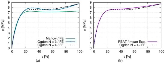(a) FE simulated stress–strain curves for the selection of a best suitable material model (Ogden, N = 4) to describe PBAT deformation behavior; (b) comparison of experimental and FE stress–strain curves (Ogden N = 4).